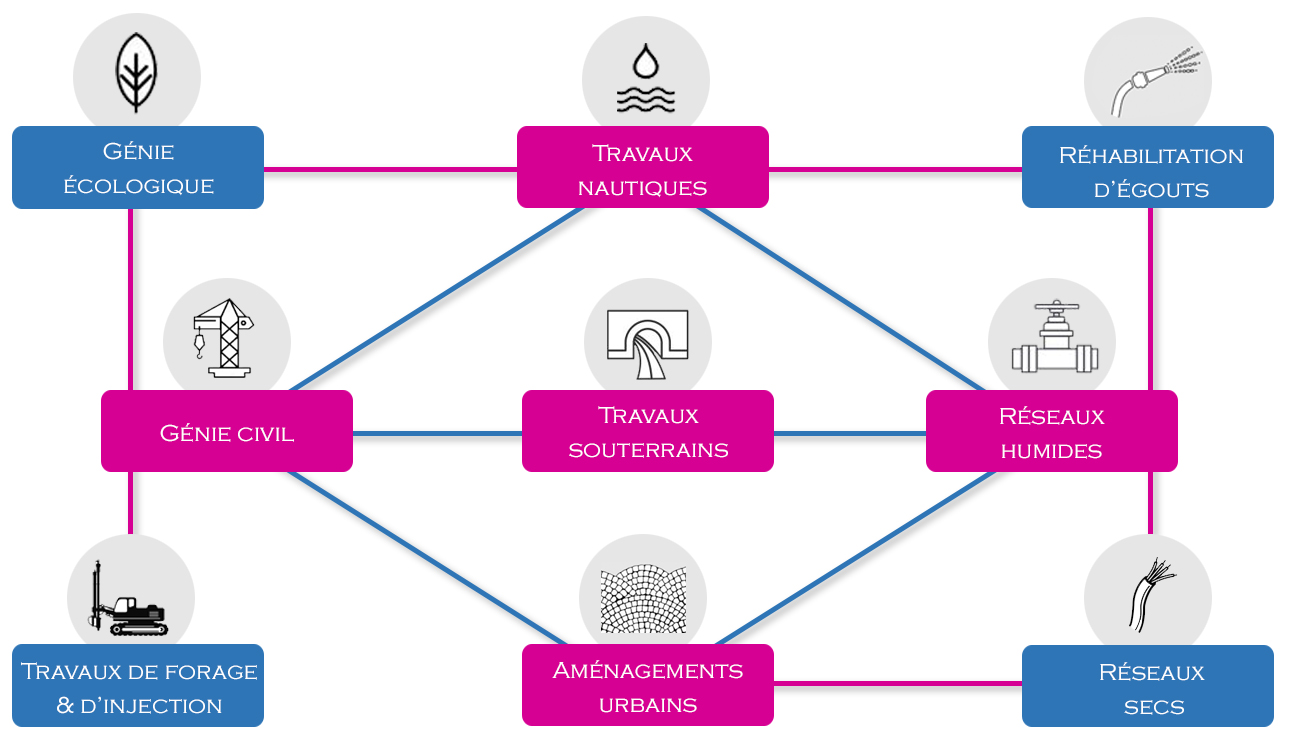 Spécialisée dans les métiers de l’environnement et forte d’une longue expérience, particulièrement en milieu urbain, l’entreprise a développé des compétences dans le domaine des réseaux et ouvrages de génie civil divers à ciel ouvert ou en souterrain.